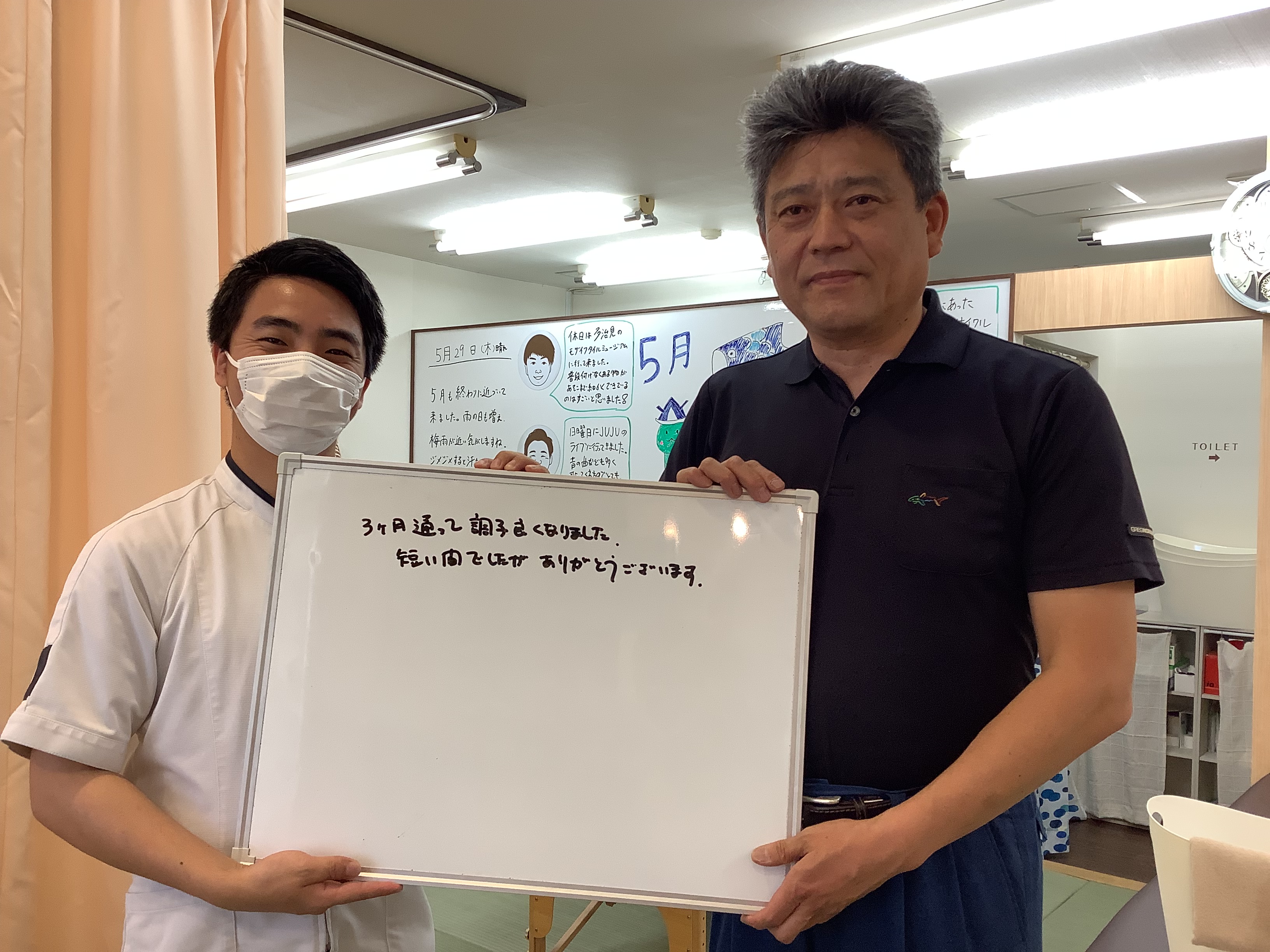 始めは腰を少しでも動かそうとすると痛みが強く出ていましたが、段々と痛みも落ち着き、立ち上がりやいろんな動作をスムーズに行えるようになりました!